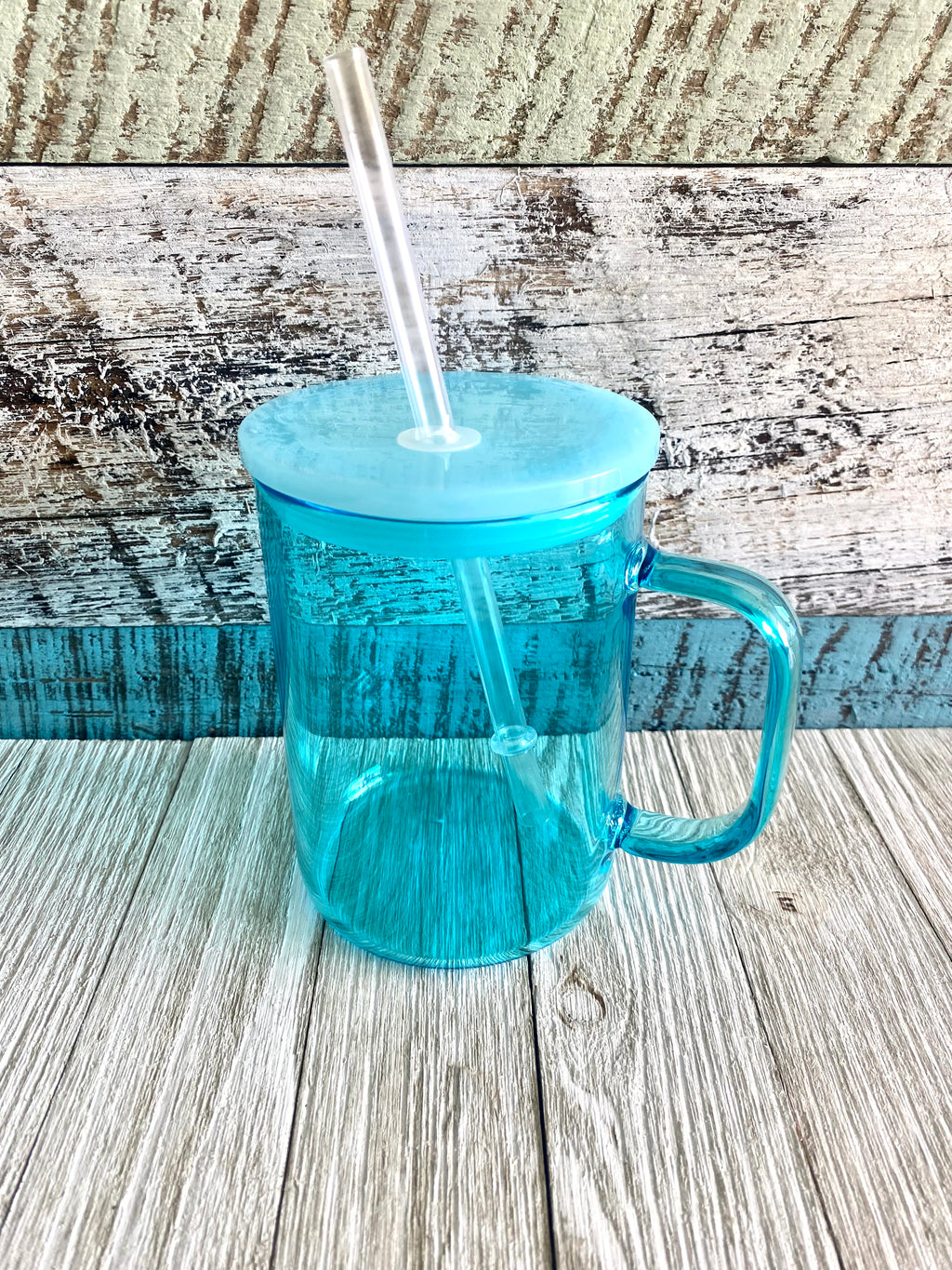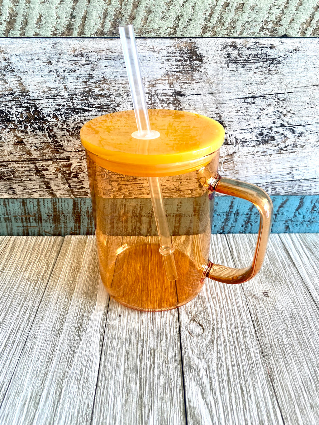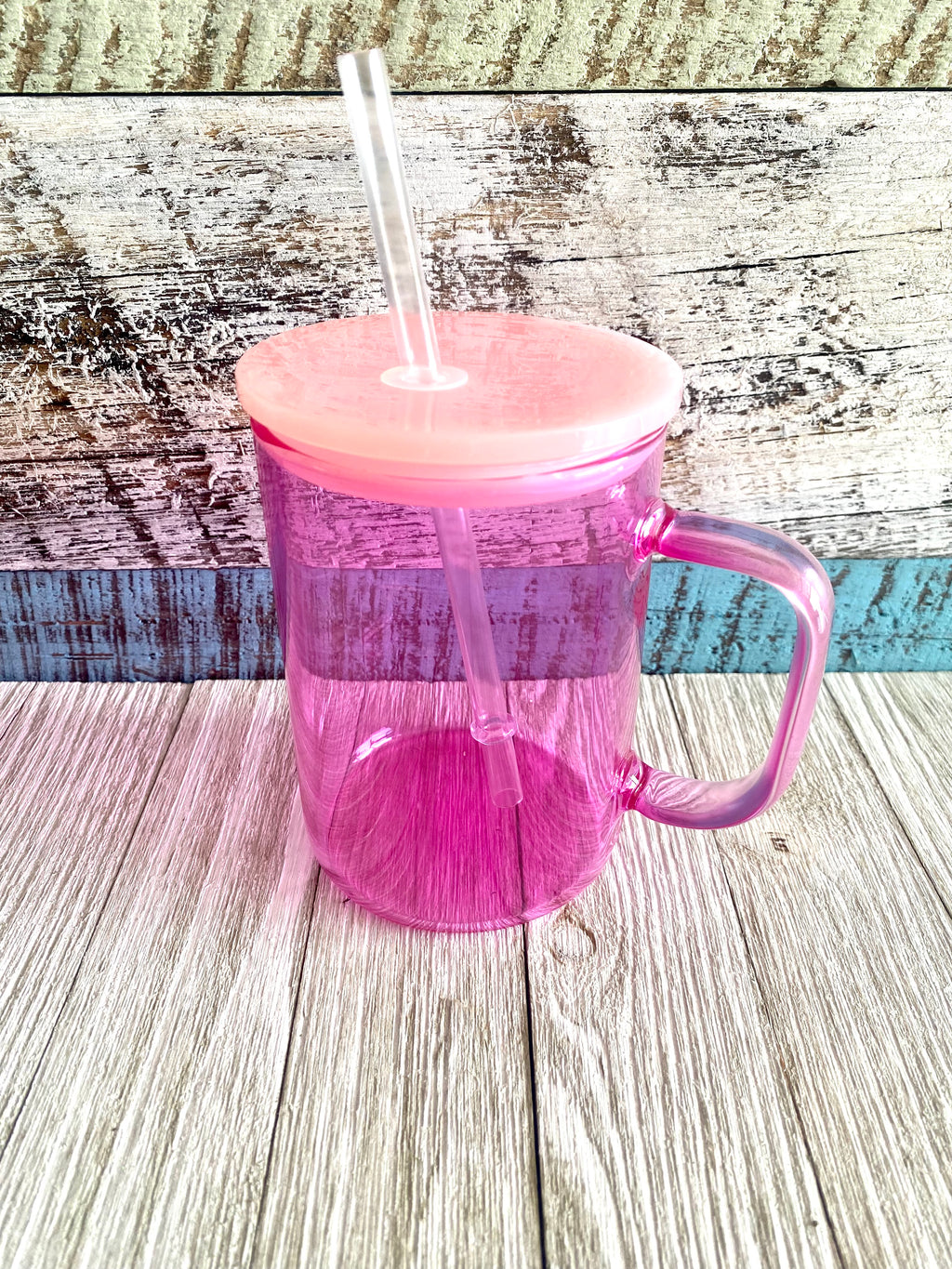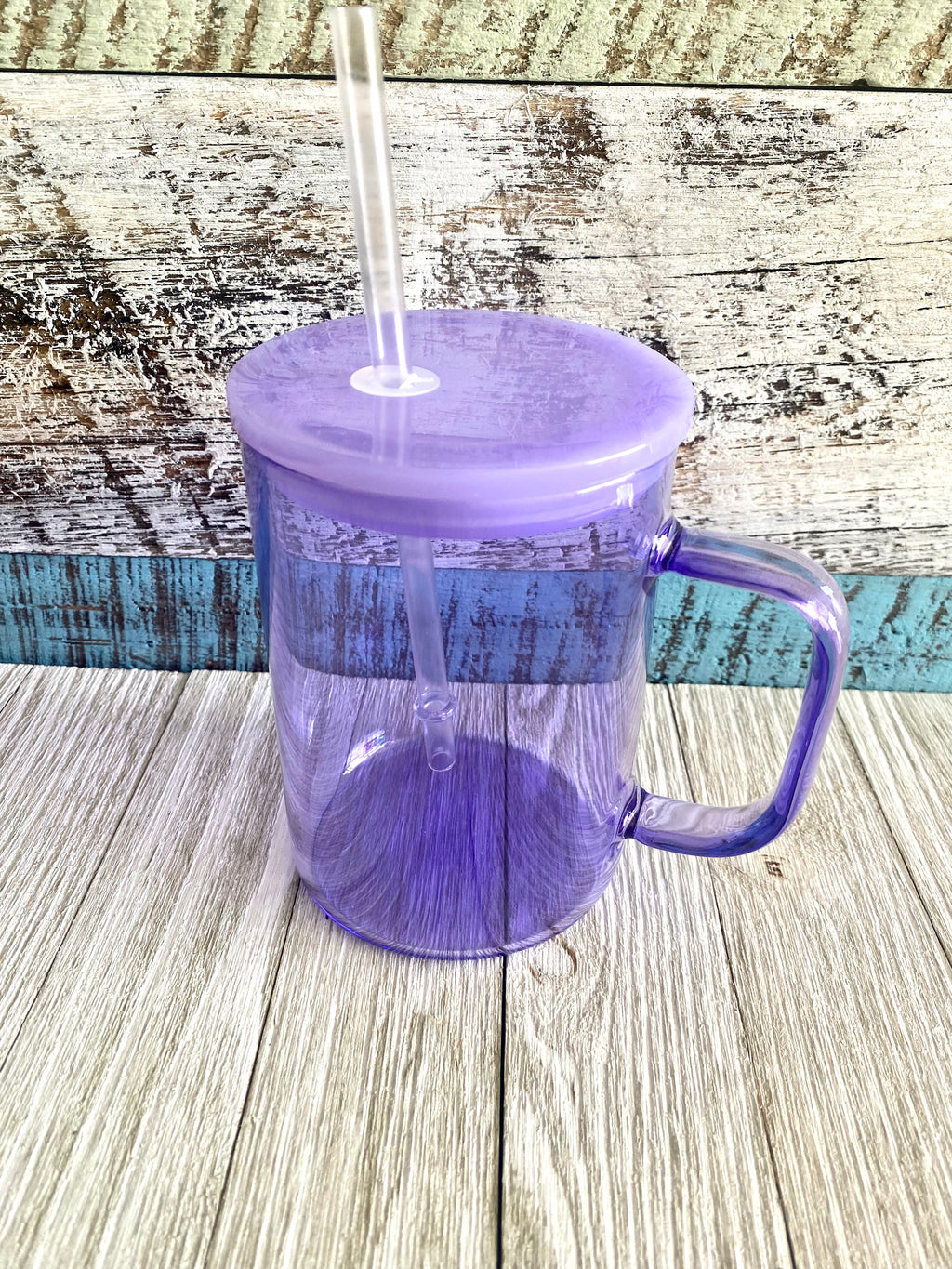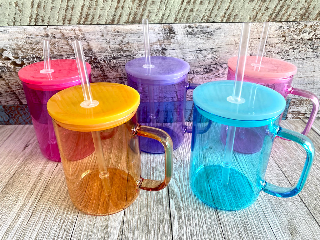 15oz jelly colored glass cups with handle comes with plastic lid and straw.